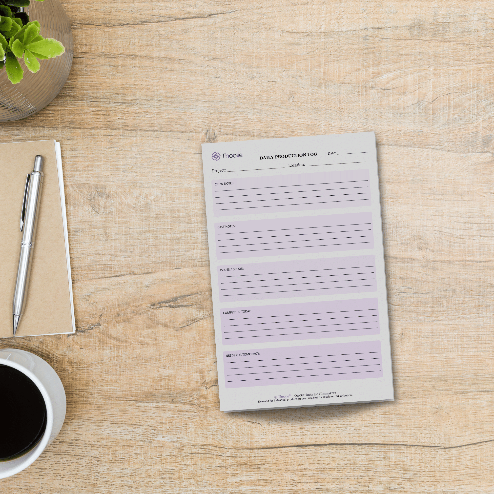 The Daily Production Log Notepad is designed to record completed work, missed shots, delays, and production notes. This creates a clear record that can be referenced during post-production, scheduling adjustments, or internal review.