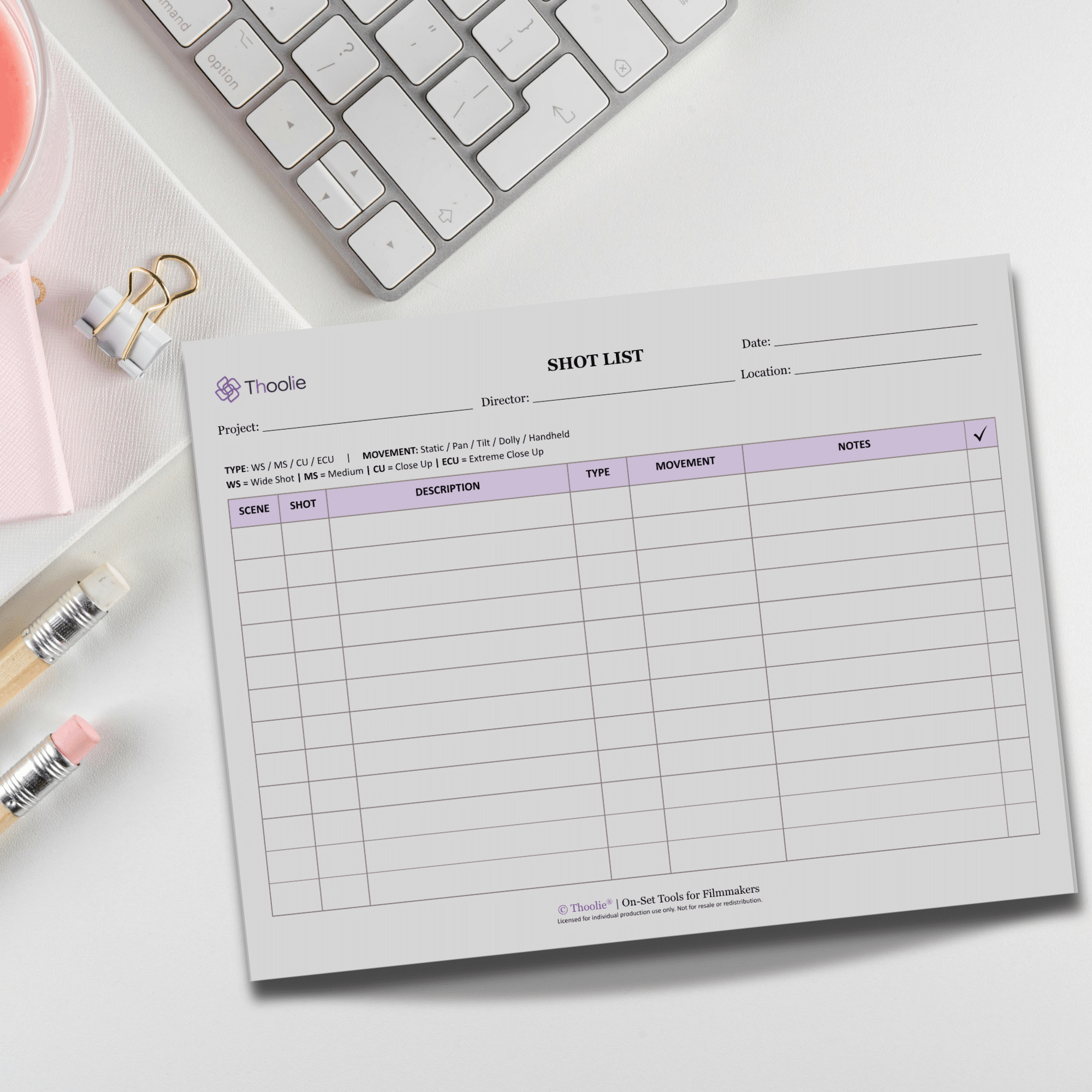 The Shot List Notepad available in the Thoolie Collective is designed for active use during production. It provides a structured format that allows directors, assistant directors, and cinematographers to track shots as they are completed and make adjustments without interrupting workflow.